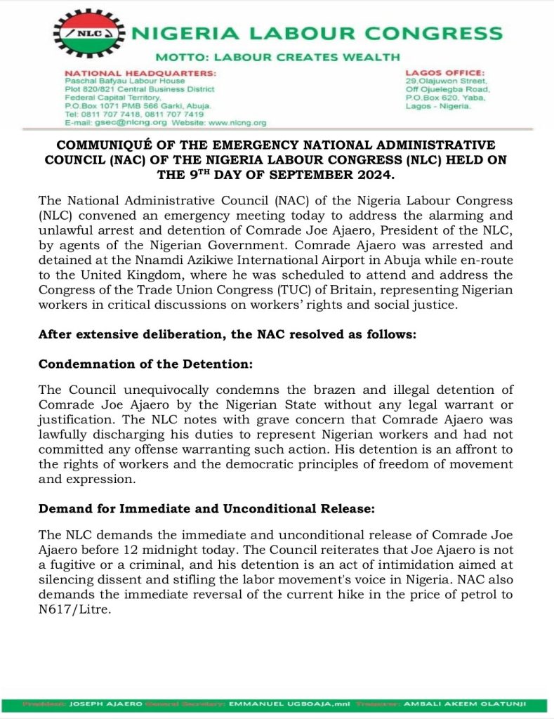 The NLC also called for an immediate reversal of the petrol price hike to ₦617 per litre and placed its affiliates, state councils, and the general public on high alert. In response to the situation, the NLC has scheduled an emergency National Executive Council (NEC) meeting for Tuesday, September 10, to discuss further actions.